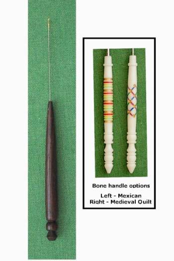 A long flexible beading needle with the eye facing outwards ideal for taking sewings